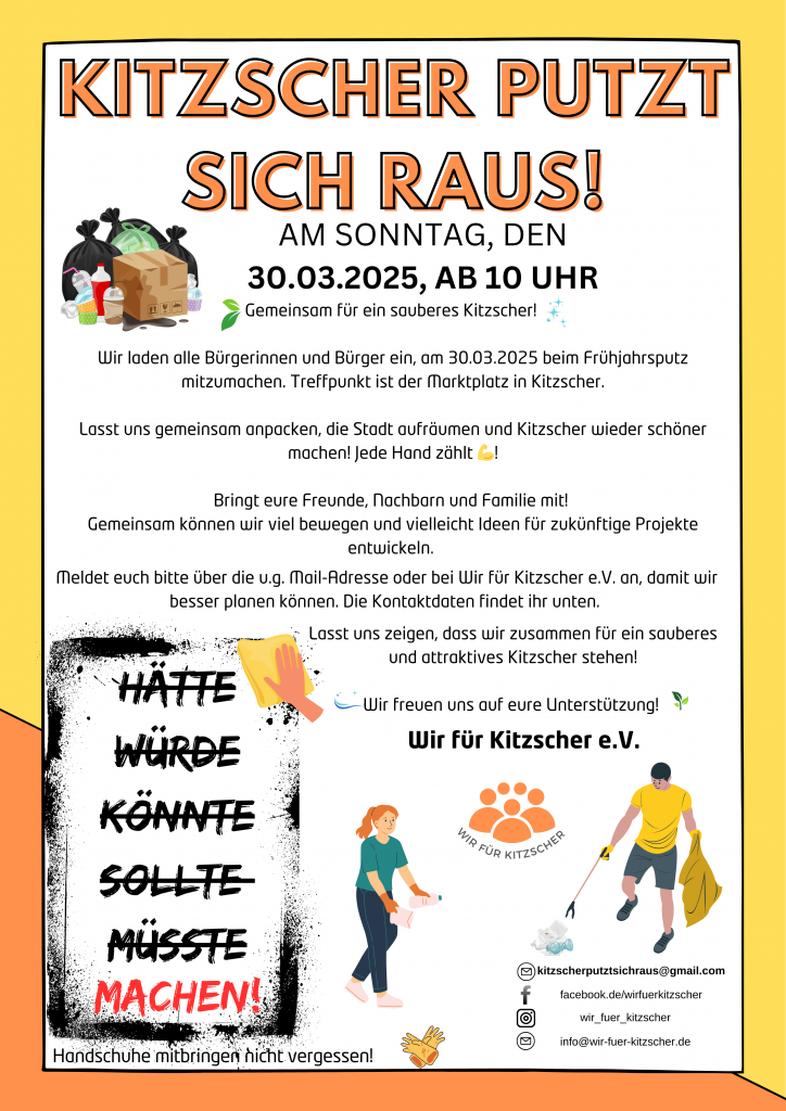 Unsere Stadt soll schöner werden – das wünschen sich viele. Doch anstatt nur Kritik zu üben, beginnt Veränderung bei uns selbst. Warum also nicht gemeinsam Verantwortung übernehmen und aktiv werden? So war die Idee einer Aufräumaktion in Kitzscher geboren… Und nun können wir stolz sagen: Die Aktion war ein voller Erfolg!